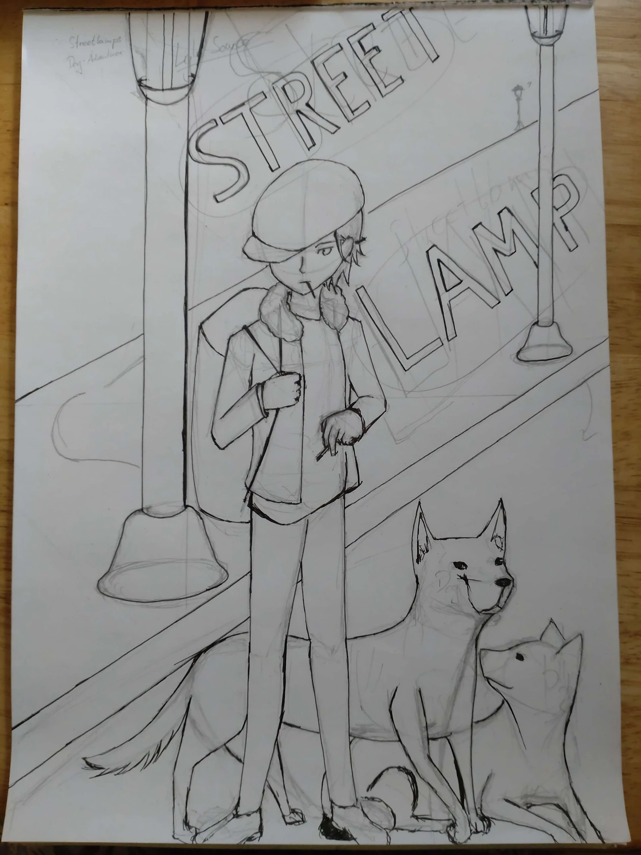 I free-handed the dogs without reference, so they're maybe not the correct proportional size to the person in front. I might generally have to do some perspective practice, if I'm looking at those lamps. The one in the back probably shouldn't be as small as it is...