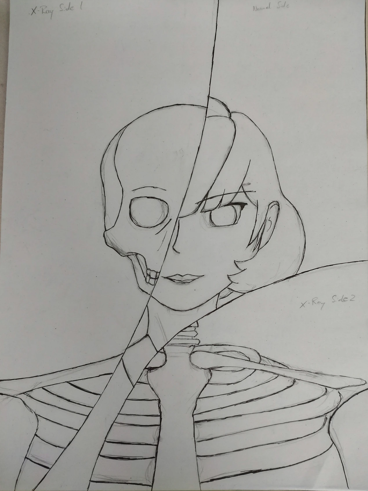 The concept was a half and half sort of x-ray image of a person (To me, that is probably going to be a well-dressed girl, because that comes easiest to me). I am probably going to have to use references for this, because I can't really picture a rib-cage from memory.