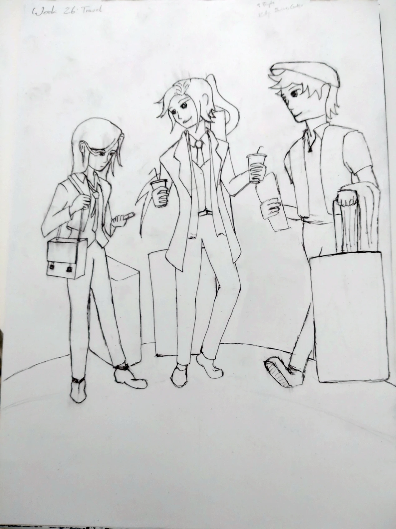 I don't feel too comfortable in sharing my writing, so I won't, at least not yet. Suffice it to say that the figure to the left and in the center of the sketch already have a comprehensive description littered throughout the work, hence why they were pretty easy to pencil in. The one on the right is relatively new and doesn't yet. They're also not technically characters that would travel a lot, now that I think about it. I just tend to default to starting with them, because I like the design.