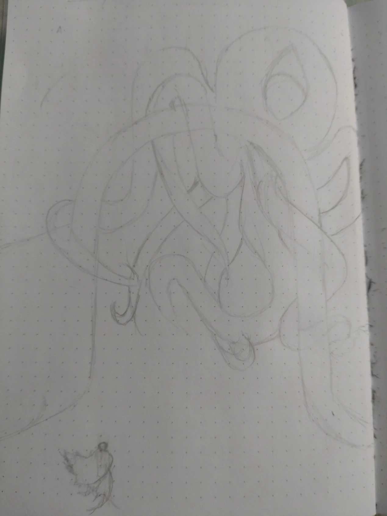The initial sketch features me struggling with fitting all the octopus-limbs into the frame, and also struggling with constructing the walls adjacent to the doorway. From the left side of the doorway it's somewhat apparent that I don't have an intuitive understanding of how these are usually constructed.