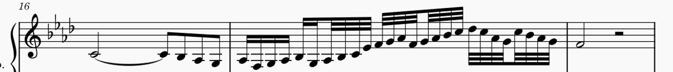 This segment will constitute the main part of my melody. Characteristic is the tied note playing into eights as filler and the syncope in the left. The MIDI is being cheeky and swallows the way the syncope is supposed to just brush underneath the melody and not draw further attention to itself.