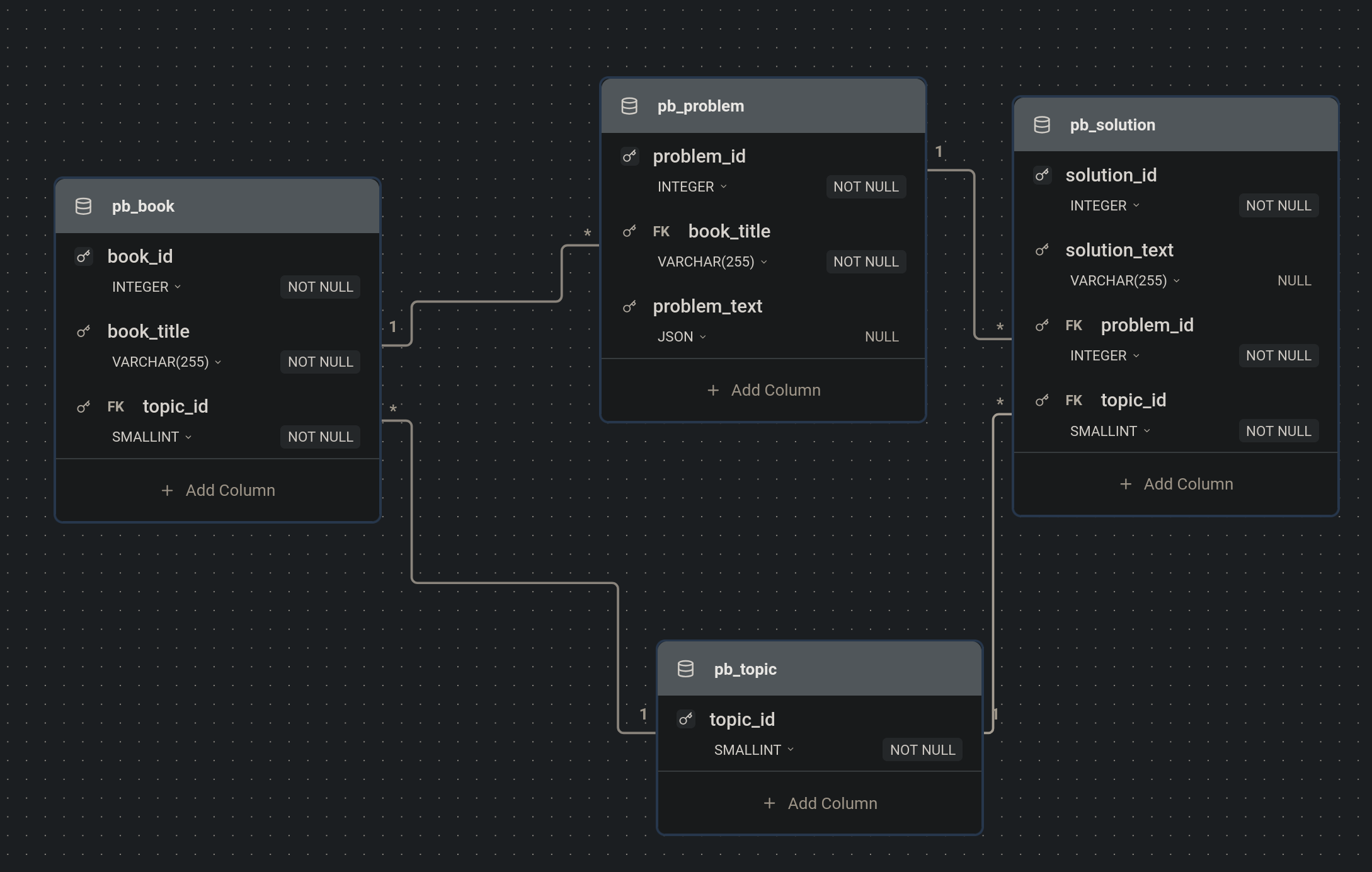 I'm pretty sure this is what I'm angling for, except that the problem_text and solution_text fields will be blobs containing LaTeX. I used dbschemasmith.com, and didn't find the blob option, but I'll change the SQL Script by hand, when I do the setup.